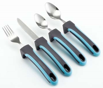 Besteck-Set für Personen mit eingeschränkter Handbeweglichkeit. Bestehend aus Messer mit Wellenschliff, Gabel, Esslöffel und Teelöffel. Selbststehend, ermöglicht leichteres Greifen und Ablegen des Bestecks, rutschfeste Gummierung auf der Griffunterseite, spülmaschinenfest, grau-türkis.