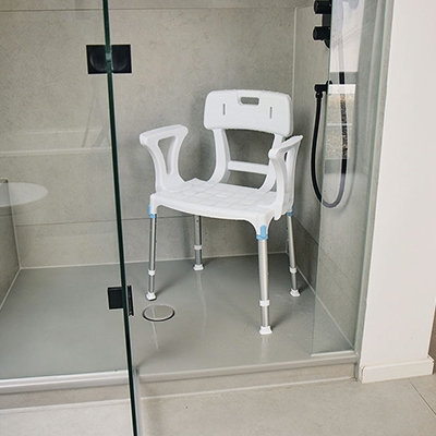 Produkteigenschaften: Duschstuhl aus Kunststoff mit Rücken- und Armlehne, rutschsicheren Füßen und abgerundeten Ecken. Die Sitzhöhe ist 7-fach verstellbar von 39 - 54 cm. Sitzfläche: 50 x 30 cm, Stellfläche: 53 x 36 cm, max. Belastbarkeit: 150 kg.