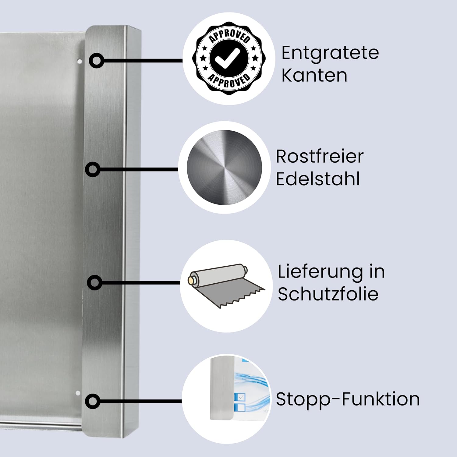 Der polierte Edelstahl sorgt durch sein optimiertes Schliffbild für einen optimalen Schutz gegen Bakterien. Trotzdem ist dieser leicht zu reinigen und hält Temperaturschwankungen und Chemikalien stand.
