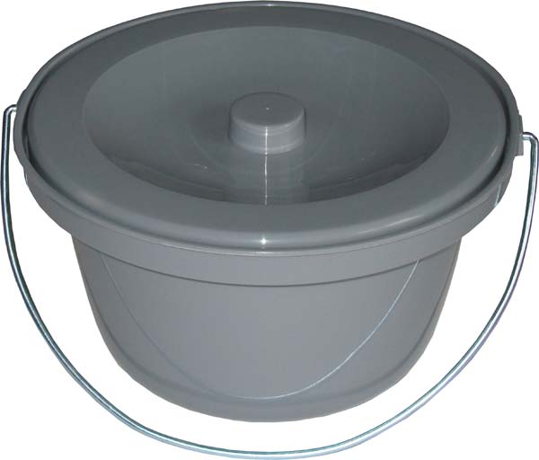 Produkteigenschaften: Toilettenstuhl-Eimer aus schlagfestem Kunststoff, passend für alle Standard-Toilettenstühle, mit Wasserrand, Deckel und Metallbügel. Höhe: ca. 17 cm, Ø ca. 31 cm.