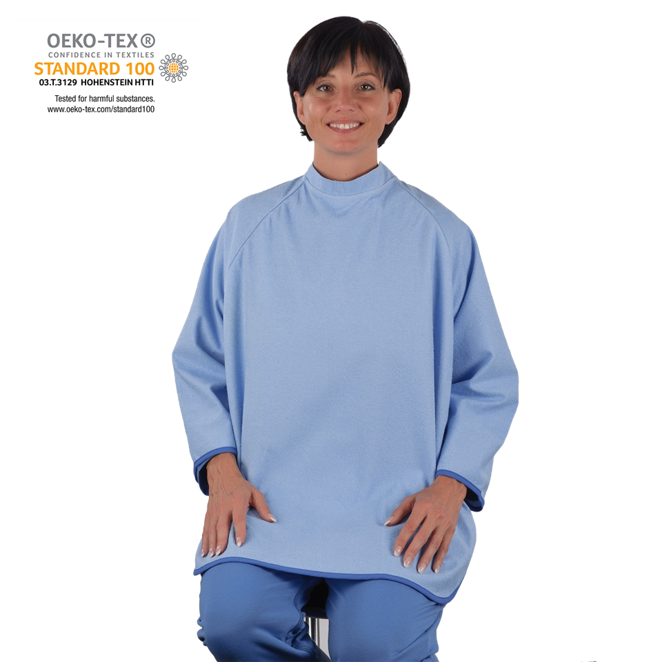Körperliche Einschränkungen führen häufig dazu, dass Essen oder Getränke verschüttet werden und auf die Kleidung gelangen. Die suprima Ess-Schürze mit Ärmeln sorgt dafür, dass Kleidungsstücke zuverlässig und umfassend geschützt werden. Durch die leicht saugende Oberfläche werden Lebensmittel sofort von der Schürze aufgenommen laufen nicht auf umliegende Textilien herunter. Dabei ist die Ess-Schürze äußerst hygienisch, da sie bei hohen Temperaturen gewaschen werden kann. Durch praktische Schlaufen zum Binden im Nackenbereich kann die Schürze einfach angelegt und ein Wegziehen verhindert werden. Die feuchtigkeitsundurchlässige Beschichtung sorgt dafür, dass der Brustbereich des Tragenden bei jeder Mahlzeit zuverlässig geschützt ist.