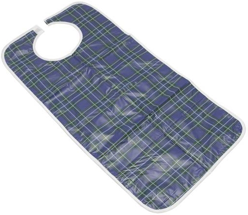 Produkteigenschaften: Esslätzchen aus wasserundurchlässiger Kunststofffolie mit Klettverschluss. Maße: ca. 45 x 90 cm, Handwäsche, blau-grün kariert.