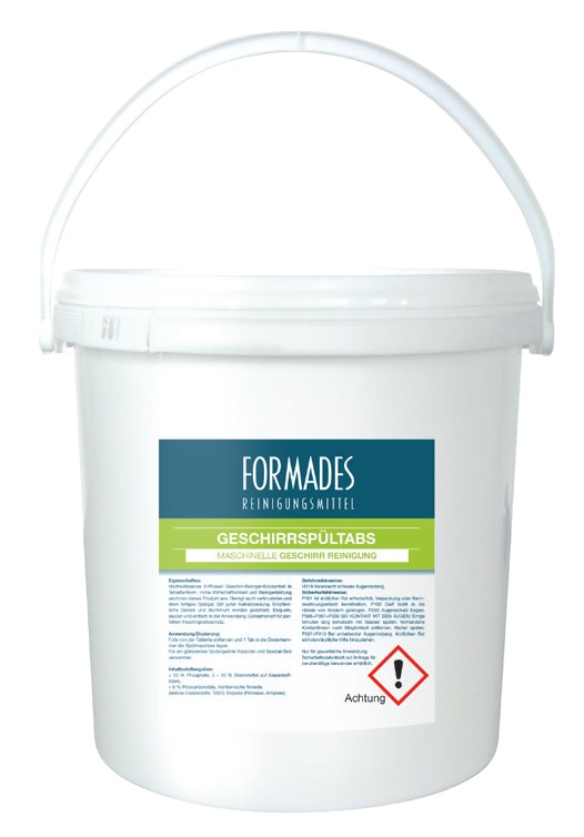 FORMADES Geschirrspültabs können in allen gängigen Haushaltsspülmaschinen eingesetzt werden. Das hochwirksame 2-Phasen Geschirrreiniger Konzentrat in Tablettenform zeichnet sich durch hohe Wirtschaftlichkeit und Reinigerleistung aus. Bequem, sauber und einfach in der Anwendung. Die Tabs sind cellophaniert zum Schutz vor Feuchtigkeit.