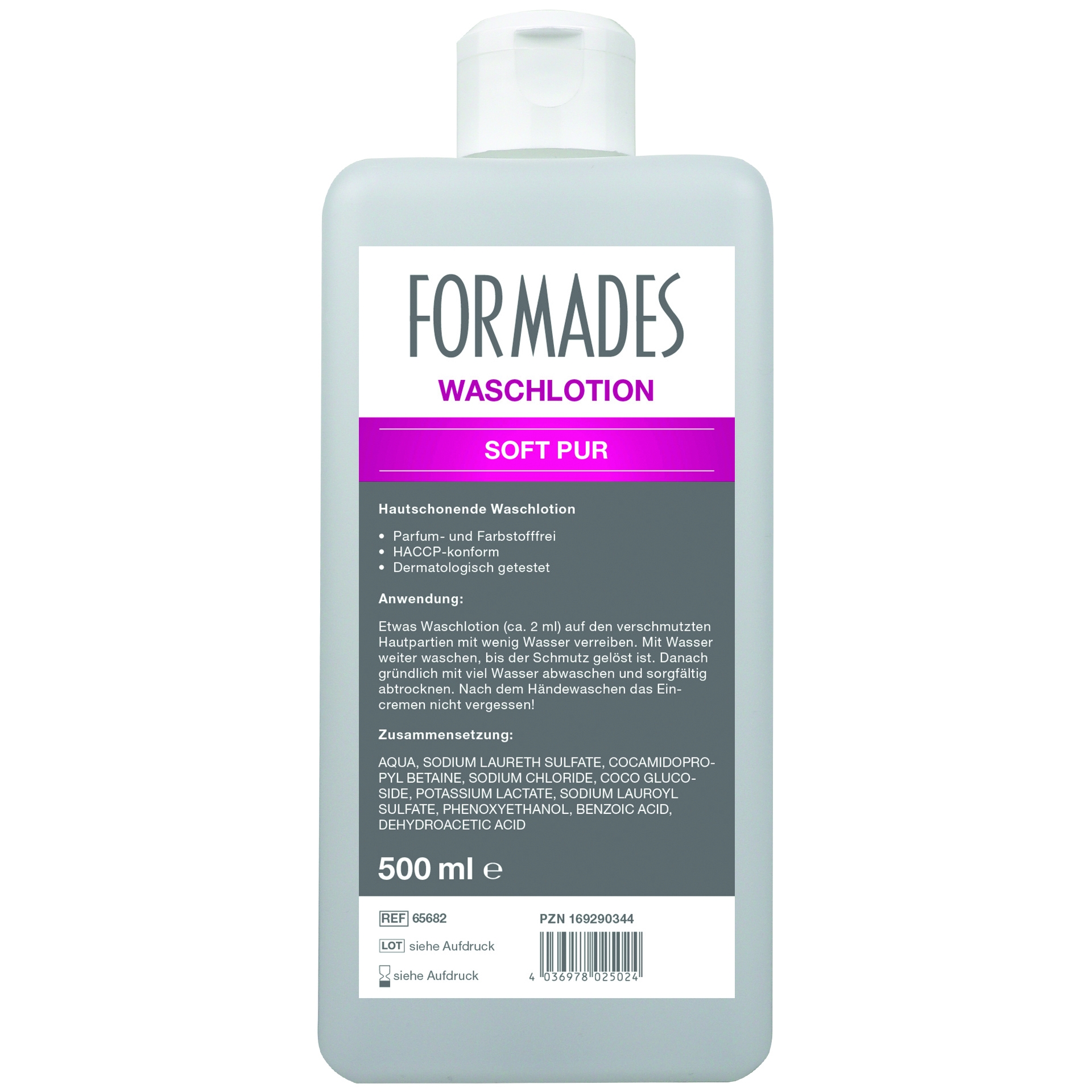 Die Formades SOFT PUR ist eine parfüm- und farbstofffreie, pH- hautneutrale und rückfettende Waschlotion, die den körpereigenen Hautschutzfilm schont und eine Austrocknung somit zuverlässig verhindert.