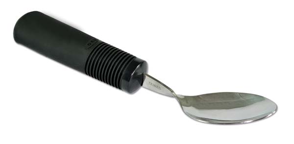 Besteck für Personen mit eingeschränkter Handbeweglichkeit. Rutschfester Vollgummigriff, stoßdämpfend, spülmaschinengeeignet, Grifflänge: 11 cm, Griff-Ø: 3,5 cm, Gewicht: 80 g. Ausführung: Esslöffel, biegsam und einmal individuell anpassbar, schwarz.