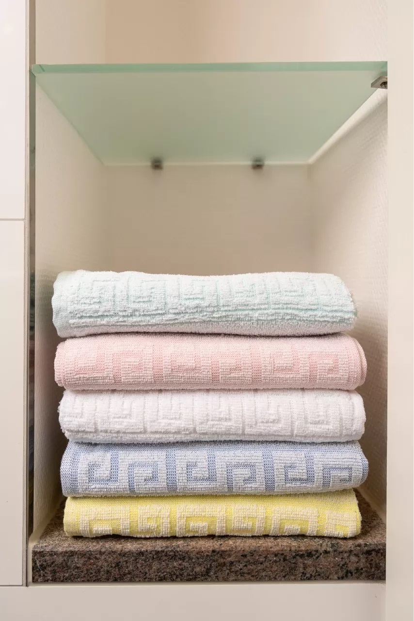Das charakteristische Design mit griechischer Bordüre verleiht der Frottierwäsche eine klassische Note.