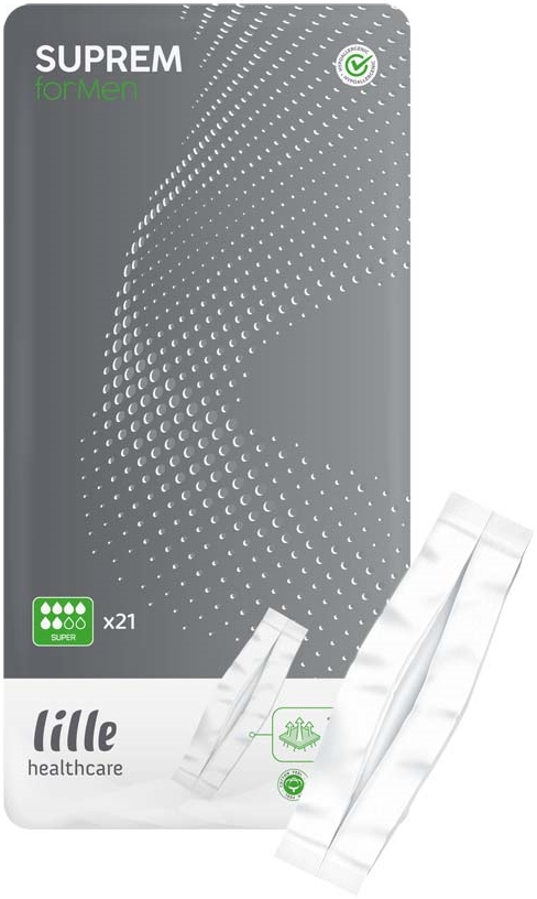 Produkteigenschaften: Slipeinlagen mit Klebestreifen für Männer bei mittlere Blasenschwäche. Atmungsaktiv, geruchsneutralisierend, latexfrei, Saugstärke gemäß ISO: 1.060 ml, 6 von 8 Tropfen, Größe: 40 x 24 cm.
