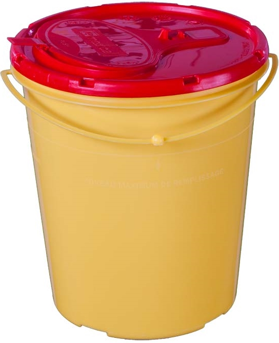 Kanülen-Eimer aus Polypropylen zur Entsorgung von spitzen, scharfen und gefährlichen Gegenständen im stationären und ambulanten Bereich mit universeller Abzieh-/Abdrehvorrichtung für alle gängigen Kanülentypen und Insulinspritzen, rund, Volumen: 1,5 Liter, gelb.