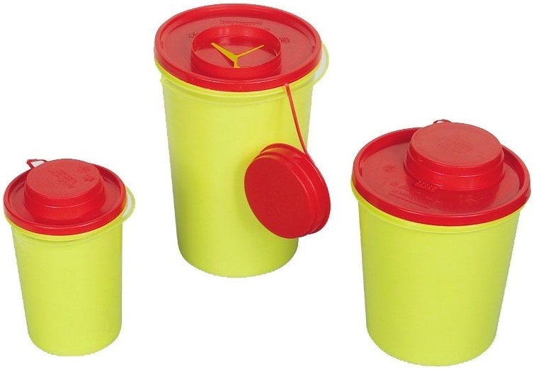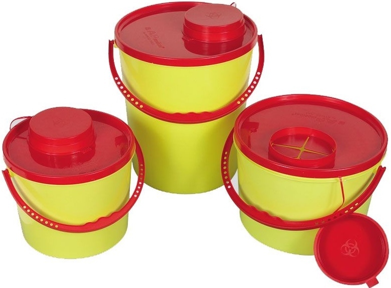 Kanülen-Eimer aus Polypropylen zur Entsorgung von spitzen, scharfen und gefährlichen Gegenständen im stationären und ambulanten Bereich mit universeller Abzieh-/Abdrehvorrichtung für alle gängigen Kanülentypen und Insulinspritzen, rund, Volumen: 2,5 Liter, gelb.