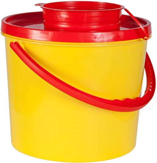 Kanülen-Eimer aus Polypropylen zur Entsorgung von spitzen, scharfen und gefährlichen Gegenständen im stationären und ambulanten Bereich mit universeller Abzieh-/Abdrehvorrichtung für alle gängigen Kanülentypen und Insulinspritzen, rund, Volumen: 5,0 Liter, gelb.