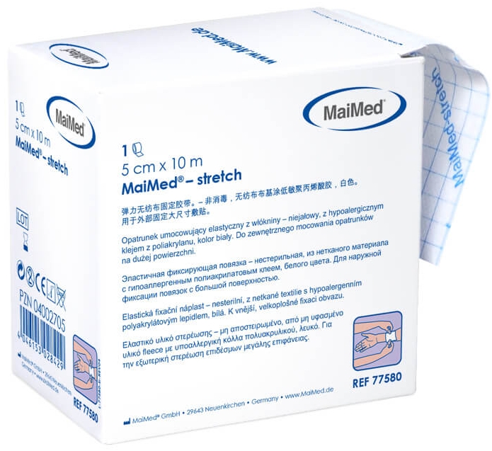 MaiMed® stretch ist ein elastisches Fixierpflaster, das speziell zur sicheren Fixierung von Verbänden, Kompressen oder medizinischen Geräten auf der Haut entwickelt wurde. Es besteht aus einem elastischen und atmungsaktiven Material, das sich den Körperkonturen flexibel anpasst und somit auch bei Bewegungen einen hohen Tragekomfort bietet. Die hypoallergene und latexfreie Klebeschicht sorgt für einen sicheren Halt, ohne die Haut zu irritieren, und ist daher besonders hautfreundlich.