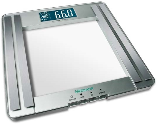 Ganzkörperanalyse-Waage mit 8 mm Sicherheitsglas, hochwertige Edelstahl-Elektroden, 4 hochpräzise Sensoren, 10 Speicherplätze, Step-On-Einschaltung, automatische Abschaltung, integrierte Kalorienbedarfsanalyse (BMR), großes LCD-Display, Messung von: Gewicht, Körperfett, Körperwasser und Muskelmasse. Messung in 100 g Schritten, maximale Tragkraft: 180 kg.
