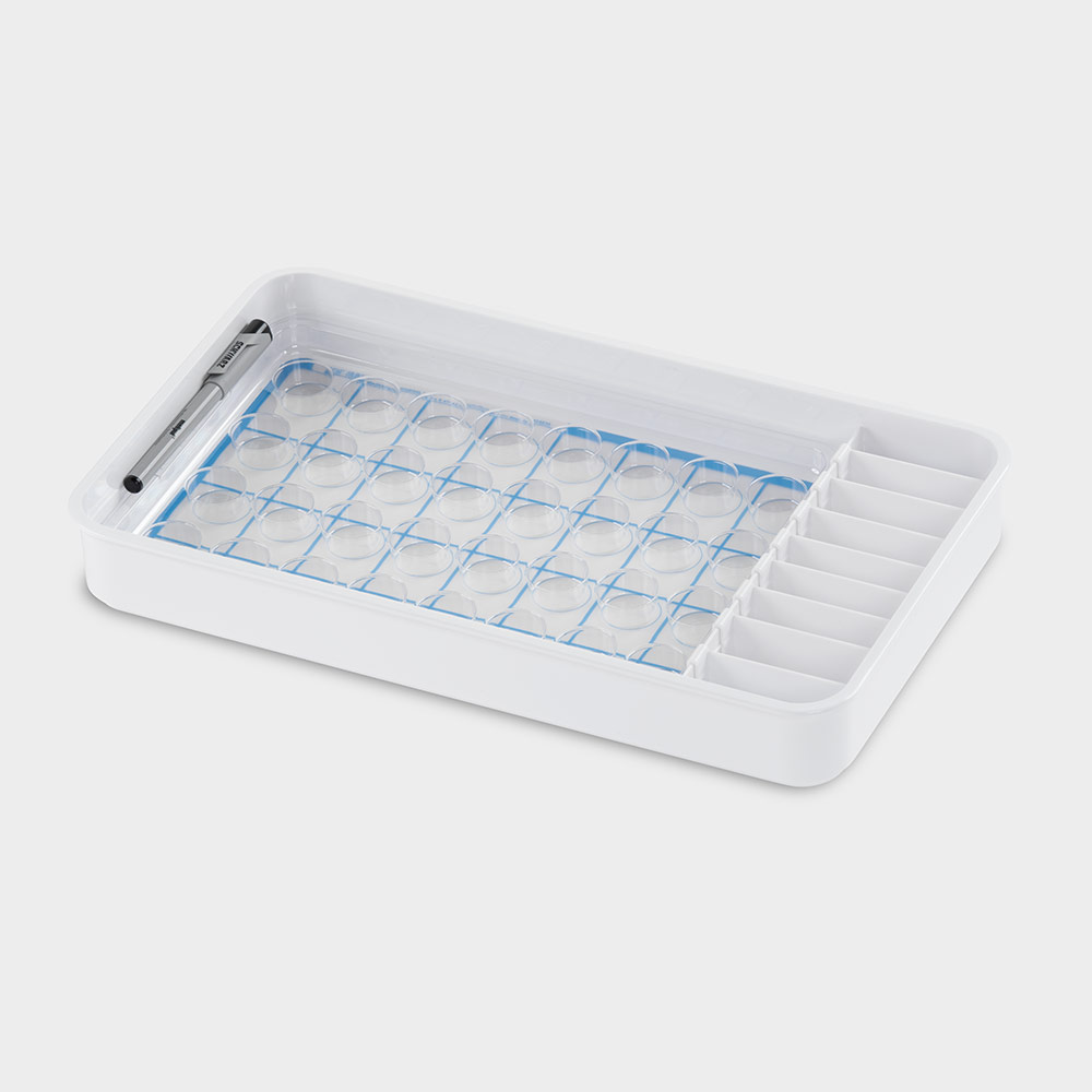 Mit Tablett-Einsatz, für 32 Becher, Tabletten oder Tropfen und Pulver-Tütchen, mit Beschriftungsfolie, verschiebbarem Teilersystem und Folienstift.