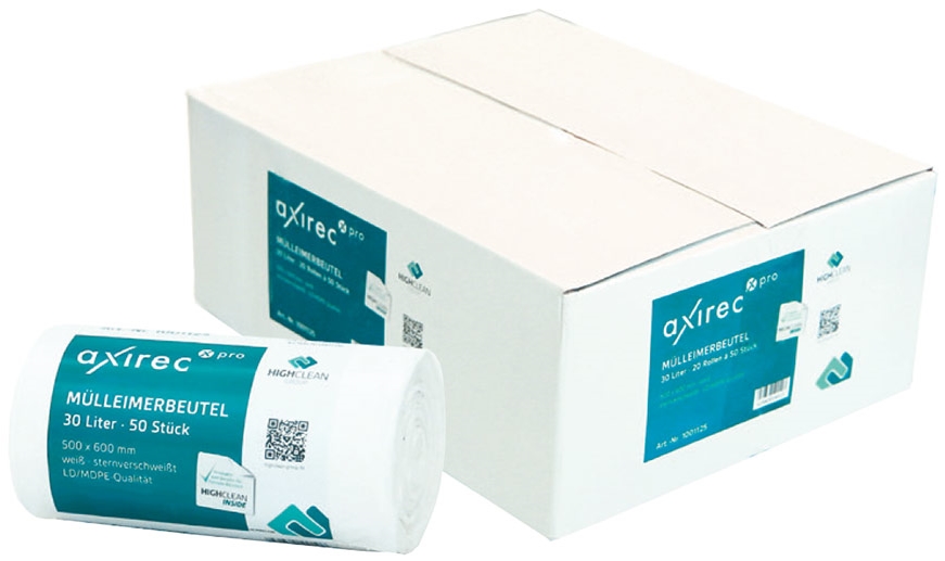 Die axirec pro Müllbeutel sind aus dickwandigem LDPE produziert. Neben der täglichen Entsorgung in der Unterhaltsreinigung sind sie damit auch für schwere und kantige Abfälle, wie sie z.B. in Teeküchen anfallen, bestens geeignet.