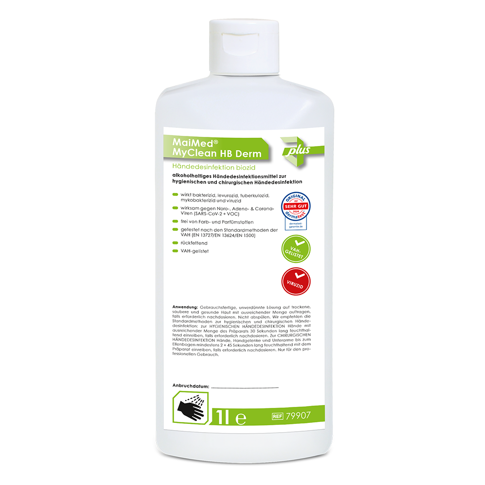 Das MaiMed® MyClean HB Derm ist ein hochwirksames, alkoholhaltiges Händedesinfektionsmittel zur hygienischen und chirurgischen Händedesinfektion, entwickelt speziell für den professionellen Einsatz im Gesundheitswesen und in hygienekritischen Bereichen. Die moderne Formulierung wirkt bakterizid, levurozid, tuberkulozid, mykobakterizid und viruzid, inklusive zuverlässiger Wirkung gegen Noroviren, Adenoviren und Coronaviren (inkl. SARS-CoV-2 & Varianten). Ein verlässlicher Schutz, auch in anspruchsvollen Situationen.