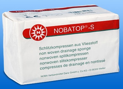 Die Schlitzkompresse entspricht der NOBATOP® 12 (6-fach) mit Y-Einschnitt. Die aus Vliesstoff bindemittelfrei hergestellte unsterile Schlitzkompresse ist 6-fach gelegt und besitzt die Saugkraft einer 12-fach gelegten Mullkompresse. Das Material ist sehr weich und deshalb angenehm auf der Haut. Die Schlitzkompresse dient als Wundabdeckung der Ein- bzw. Austrittsstellen von Sonden, Drainagen, Kathetern, Kirschner-Drähten bei Extensionen oder externen Fixateuren. 100 Schlitzkompressen befinden sich in einer Packung.