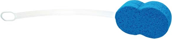 Produkteigenschaften: Rückenschwamm mit rauer Rückseite und langem Griff aus Kunststoff. Schwammgröße: ca. 15 x 9 cm, Länge: ca. 56 cm, weiß/blau.