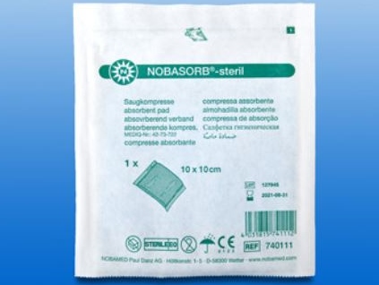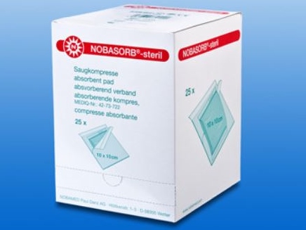 Die hochsaugfähige Wundkompresse NOBASORB® ist auf der rückwärtigen Seite mit einem flüssigkeitsundurchlässigem blauen Vlies versehen. Sie ist mit einem hoch saugfähigen Saugkörper gefüllt und wird bei stark nässenden, infizierten oder chronischen Wunden eingesetzt. Auch bei nässenden Wundheilungsstörungen kommt sie zum Einsatz. Die Saugkompressen sind einzeln steril verpackt.