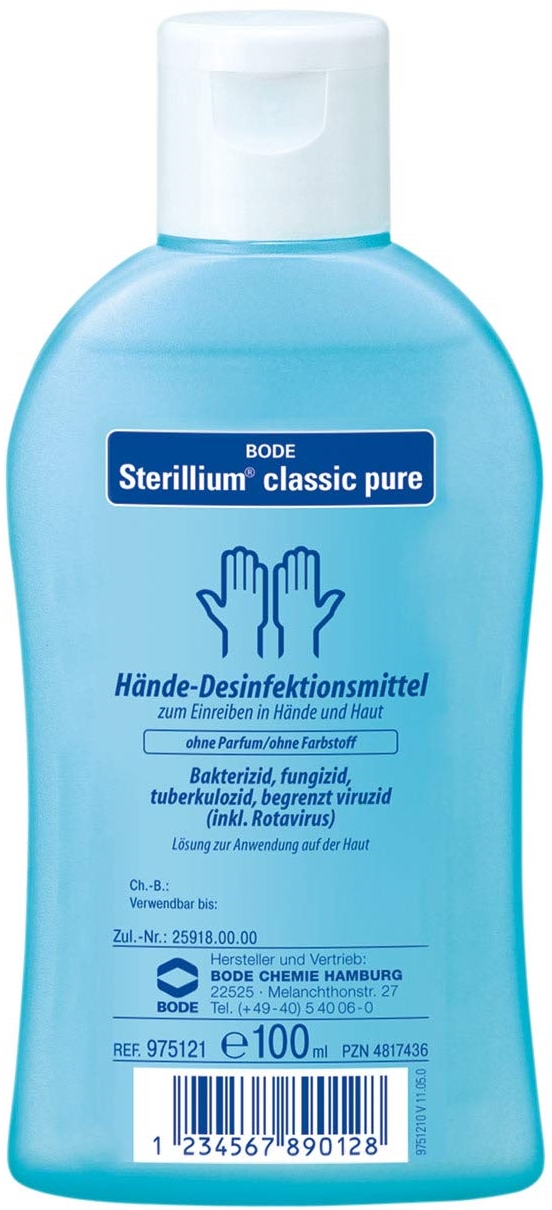 Sterilium classic pure Zusammensetzung: 100 g Lösung enthalten: Wirkstoffe: Propan-2-ol 45,0 g, Propan-1-ol 30,0 g, Mecetroniumetilsulfat 0,2 g. Sonstige Bestandteile: Glycerol 85%, Tetradecan-1-ol, Gereinigtes Wasser. Anwendungsgebiete: Zur hygienischen und chirurgischen Händedesinfektion. Zur Hautdesinfektion vor Injektionen und Punktionen. Gegenanzeigen: Für die Desinfektion von Schleimhäuten nicht geeignet. Nicht in unmittelbarer Nähe der Augen oder offener Wunden anwenden. Überempfindlichkeit (Allergie) gegen einen der Wirkstoffe oder der sonstigen Bestandteile. Nebenwirkungen: Gelegentlich kann eine leichte Trockenheit oder Reizung der Haut auftreten. In solchen Fällen wird empfohlen, die allgemeine Hautpflege zu intensivieren. Allergische Reaktionen sind selten. Warnhinweise: Die Händedesinfektion dient der gezielten Vermeidung einer Infektionsübertragung z. B. in der Krankenpflege. Sterillium classic pure soll nicht bei Neu- und Frühgeborenen angewendet werden. Die Anwendung bei Säuglingen und Kleinkindern soll erst nach ärztlicher Rücksprache erfolgen. Ein Kontakt der Lösung mit den Augen muss vermieden werden. Wenn die Augen mit der Lösung in Berührung gekommen sind, sind sie bei geöffnetem Lidspalt mehrere Minuten mit fließendem Wasser zu spülen. Ein Umfüllen von einem Behältnis in ein anderes soll vermieden werden um eine Kontamination der Lösung zu vermeiden. Wenn Umfüllen unvermeidbar ist, darf es nur unter aseptischen Bedingungen (z. B. Benutzung von sterilen Behältnissen unter Laminar Air Flow) erfolgen. Erst nach Auftrocknung elektrische Geräte benutzen. Nicht in Kontakt mit offenen Flammen bringen. Auch nicht in der Nähe von Zündquellen verwenden. Flammpunkt 23 °C, entzündlich. Bei bestimmungsgemäßer Verwendung des Präparates ist mit Brand- und Explosionsgefahren nicht zu rechnen. Nach Verschütten des Desinfektionsmittels sind folgende Maßnahmen zu treffen: sofortiges Aufnehmen der Flüssigkeit, Verdünnen mit viel Wasser, Lüften des Raumes sowie das Beseitigen von Zündquellen. Nicht rauchen. Im Brandfall mit Wasser, Löschpulver, Schaum oder CO2 löschen. mit viel Wasser, Lüften des Raumes sowie das Beseitigen von Zündquellen. Nicht rauchen. Im Brandfall mit Wasser, Löschpulver, Schaum oder CO2 löschen. Stand: 19.09.2014 Pharmazeutischer Unternehmer: BODE Chemie GmbH, Melanchthonstraße 27, 22525 Hamburg, Tel. +49 40 54006-0.