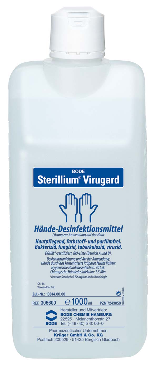 Sterillium Virugard Wirkstoff: Ethanol. Zusammensetzung: 100 g Lösung enthalten: Wirkstoff: Ethanol 99% 95,0 g. Sonstige Bestandteile: Butan-2-on, Glycerol, Tetradecan-1-ol, Benzin. Anwendungsgebiete: Hygienische und chirurgische Händedesinfektion. Gegenanzeigen: Nicht auf Schleimhäuten anwenden. Nicht in unmittelbarer Nähe der Augen oder offener Wunden anwenden. Überempfindlichkeit gegen Inhaltsstoffe. Nebenwirkungen: Selten treten leichte, diffuse Hautirritationen oder allergische Reaktionen auf. In solchen Fällen wird empfohlen, die allgemeine Hautpflege zu intensivieren. Warnhinweise: Nicht in Kontakt mit offenen Flammen bringen. Nicht in der Nähe von Zündquellen verwenden. Flasche nach Gebrauch verschließen. Flammpunkt nach DIN 51755: 0 °C. Leicht entzündlich. Elektrostatische Aufladung vermeiden. Mit alkoholnassen Händen nichts berühren. Nach Verschütten des Desinfektionsmittels sind folgende Maßnahmen zu treffen: Sofortiges Aufnehmen der Flüssigkeit, Verdünnen mit viel Wasser, Lüften des Raumes sowie das Beseitigen von Zündquellen. Nicht rauchen. Stand: 19.09.2014 BODE Chemie GmbH 22525 Hamburg Melanchthonstraße 27 Tel. +49 40 54006-0.