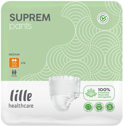 Einwegslip für Patienten mit mittlerer Inkontinenz, 100% atmungsaktiv, Geruchskontrolle, geräuscharmes Material, latexfrei, hypoallergen, 4-Linien Nässeindikator, Verschlussstreifen: platziert auf der Rückseite des Produktes zur Entsorgung, Saugkern anatomisch geformt, Saugleistung gemäß ISO: 1.300 ml, 2 von 4 Tropfen, Hüftumfang: 80 - 110 cm, Farbcode: orange.