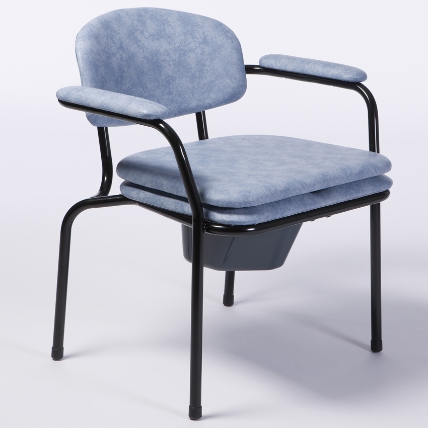 Der starre Toilettenstuhl ist platzsparend stapelbar, Farbe: blau-grau marmoriert.
