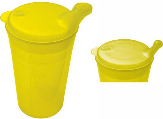 Produkteigenschaften: Trinkbecher aus Kunststoff mit Tee- und Breiaufsatz, mit kurzem Mundstück, Volumen: ca. 250 ml, autoklavierbar bis 130°C, spülmaschinenfest, mikrowellengeeignet, graduiert, gelb.