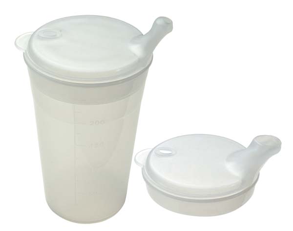 Produkteigenschaften: Trinkbecher aus Kunststoff mit Tee- und Breiaufsatz, mit kurzem Mundstück, Volumen: ca. 250 ml, autoklavierbar bis 130°C, spülmaschinenfest, mikrowellengeeignet, graduiert, transparent.