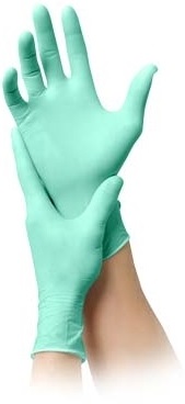 Einmal-Untersuchungshandschuhe aus Nitril mit texturierten Fingerspitzen, rechts und links tragbar, puderfrei, unsteril, biologisch abbaubar, Länge: ca. 240 cm, grün.